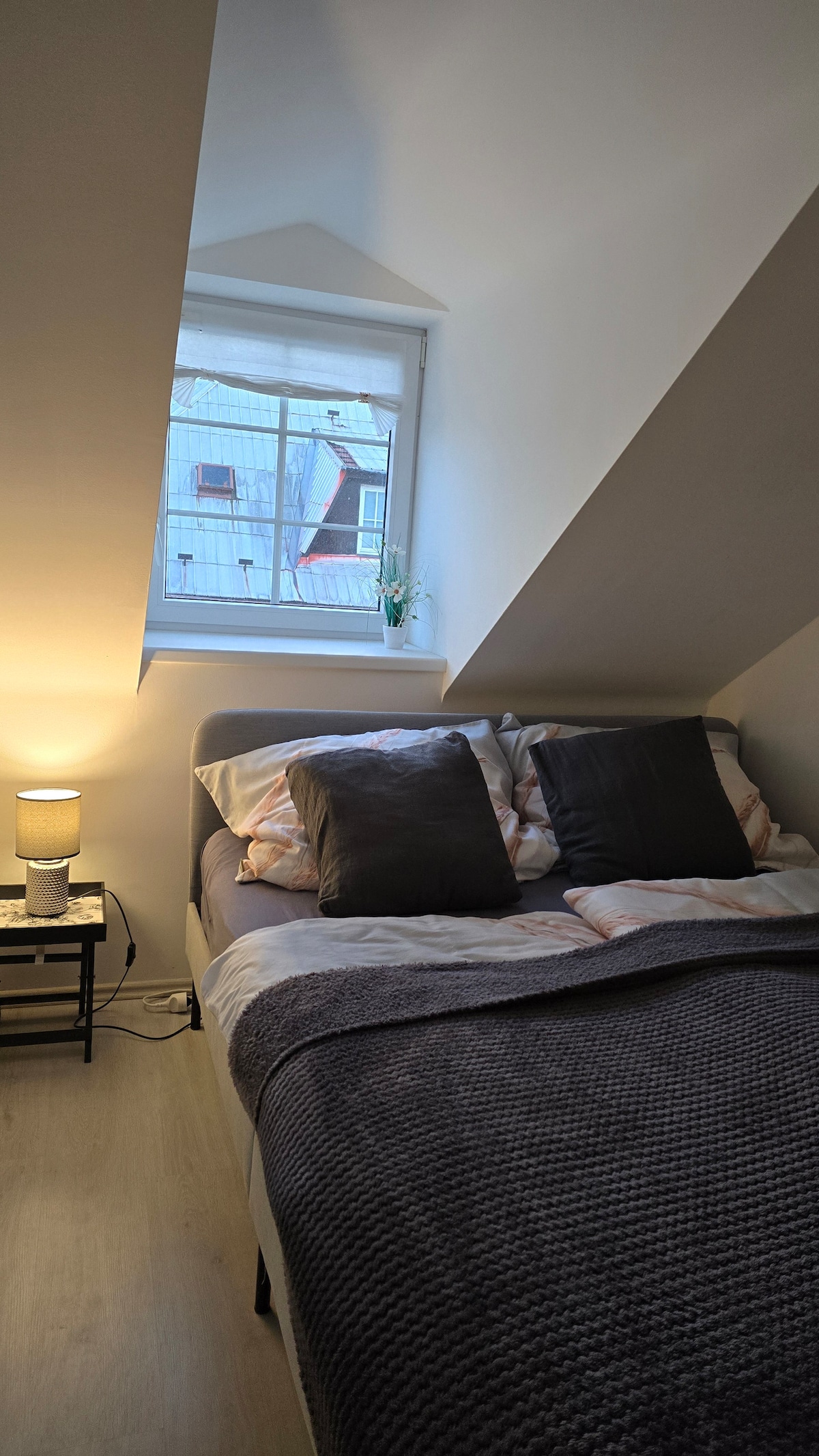 Acest studio pe acoperiș, care măsoară 46 m², se află într-o parte liniștită a clădirii și este ideal pentru cei care caută un sejur liniștit. Luminatoarele oferă suficientă lumină naturală, creând o atmosferă luminoasă și aerisită. Studioul are un pat matrimonial confortabil (160×200 cm), o bucătărie complet utilată (compactă, dar cu tot ce ai nevoie) și o baie cu duș. Este potrivit pentru unul sau doi oaspeți. Notă: apartamentul nu este potrivit pentru oaspeții în vârstă din cauza scărilor înguste.