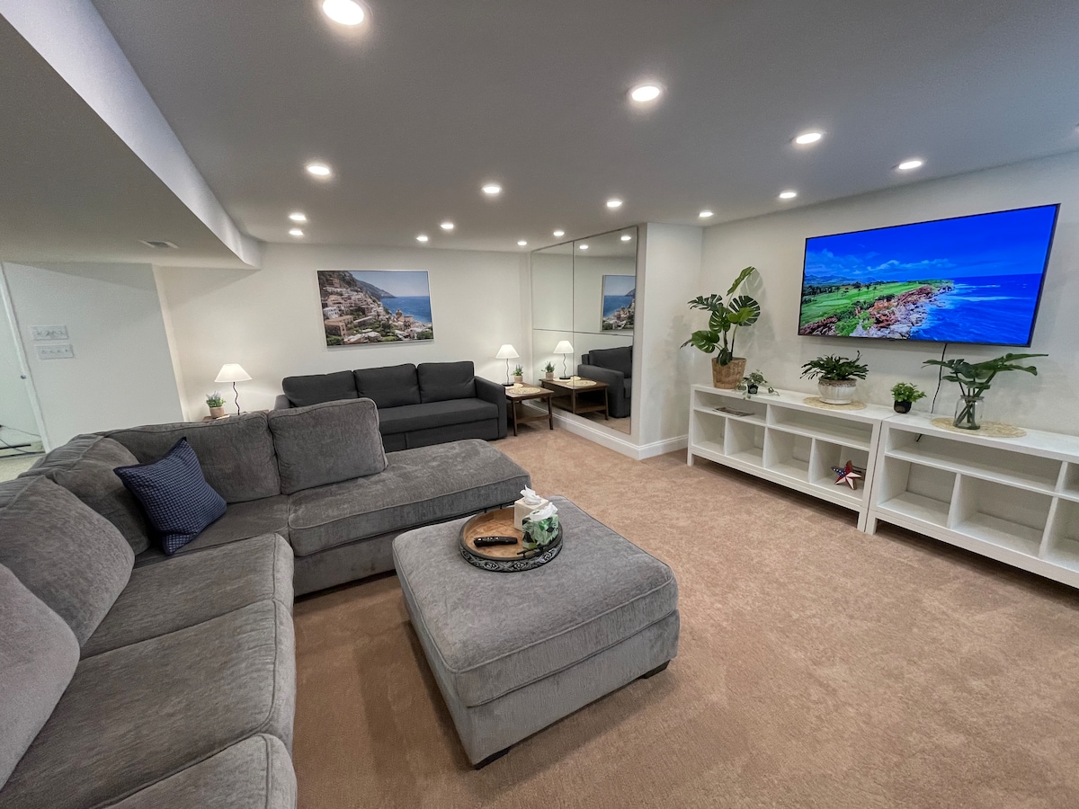 Acesta este un nivel spațios inferior al unei case nou construite. Această zonă privată de oaspeți are un lounge, o cină și o chicinetă, pe lângă un dormitor și o baie. Oaspeții împart numai intrarea principală a casei cu proprietarii care locuiesc la etaj cu proprietarii care locuiesc la etaj. Acest spațiu privat decorat include un televizor inteligent, scaune confortabile, mese pentru 4 persoane, cuptor cu microunde, cafetieră, frigider complet, prăjitor de pâine/friteuză cu aer, pat matrimonial, dulap și dulap. Masina de spalat/uscator disponibila la cerere. Te rugăm să consulți regulile casei înainte de a face o rezervare