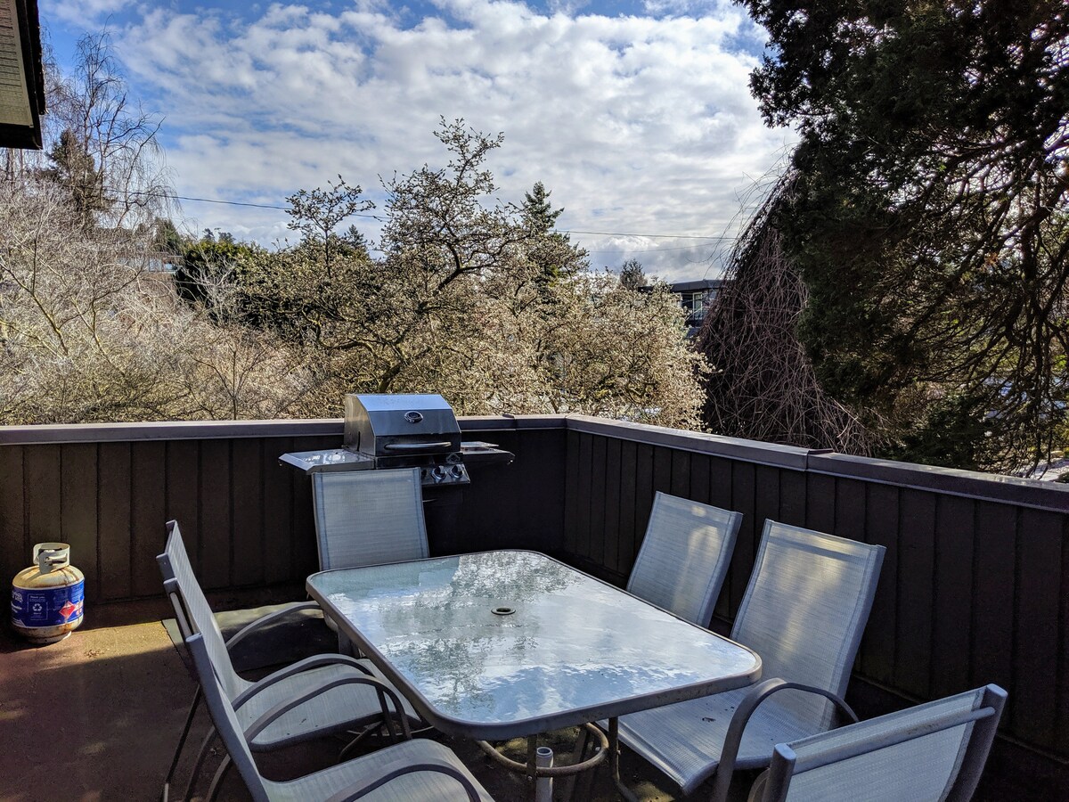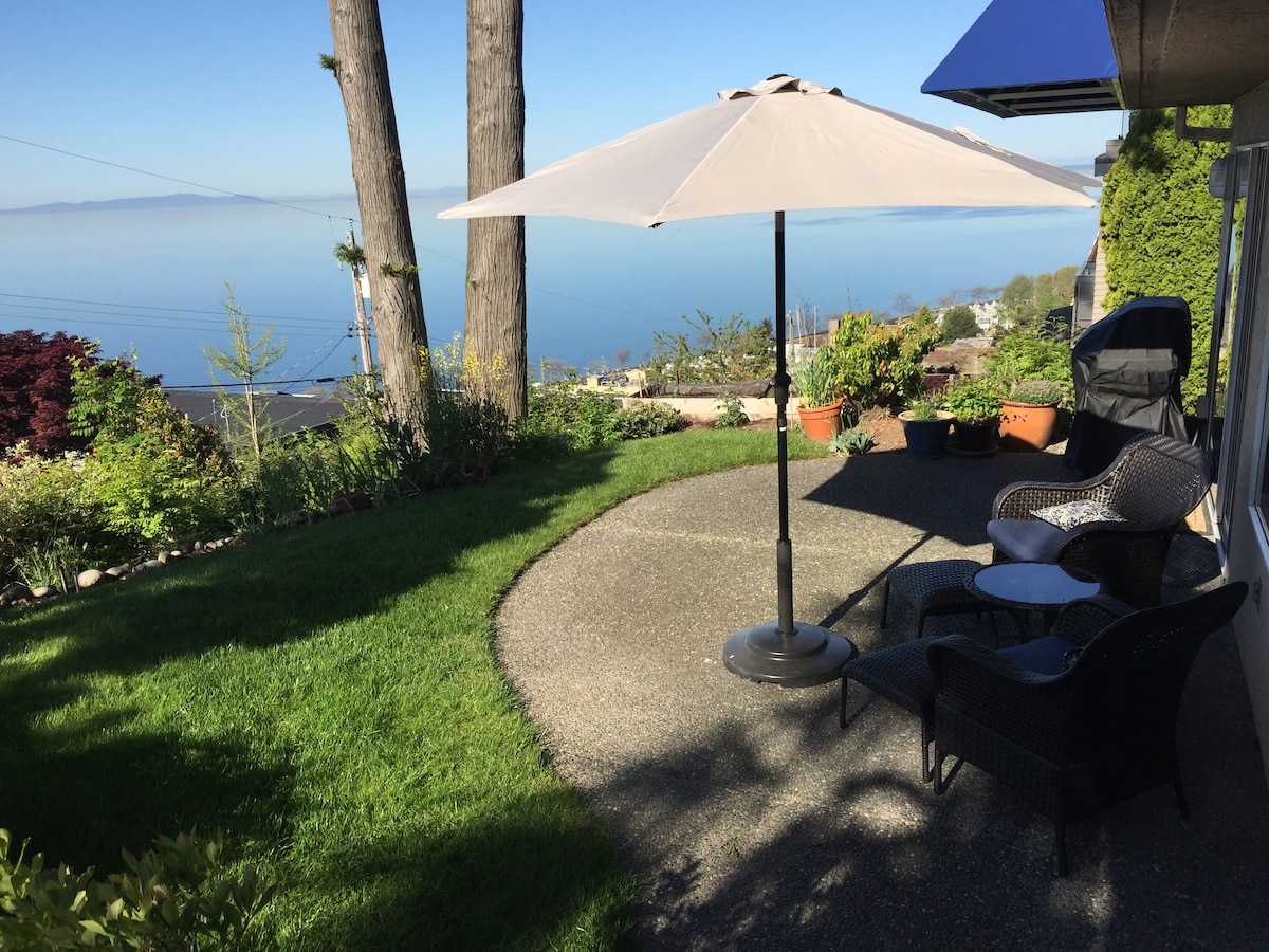 Suită legală de lux cu 2 dormitoare, cu vedere panoramică la ocean, munți și insule din golf. Două blocuri de mers pe jos până la East Beach. O plajă cu nisip spectaculoasă și o promenadă care te conectează la plaja de vest și la faimosul debarcader White Rock. Există multe restaurante și magazine drăguțe de care să te bucuri. La 5 minute de granița cu SUA și de la Spitalul Peace Arch. Transport în comun la un bloc distanță. Parcare gratuită cu permis furnizat. Intrare privată în suită autonomă într-o locuință rezidențială.