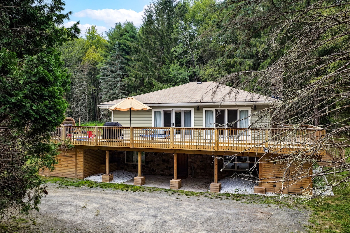 Această casă uimitoare a fost recent renovată și oferă intimitate și liniște totală - așezată pe 5 hectare la capătul unui drum liniștit. Terasa montană are o sobă cu lemne de interior, o terasă cu o priveliște frumoasă, o vatră, 3 dormitoare și 2 băi. Există o mașină de spălat/uscător, o mașină de spălat vase, o cabină de artist și un studio privat de yoga. O plimbare ușoară de 15 minute cu mașina până la Livingston Manor pentru restaurante, cumpărături și activități excelente. Acceptă animalele de companie.