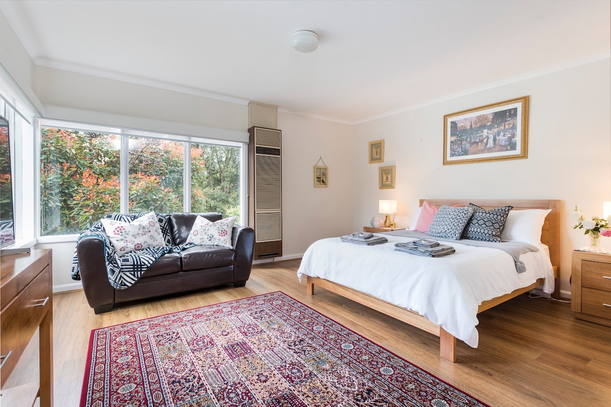 Relaxează-te în South Quarter Suite (SQS), care este un apartament foarte elegant, cu un dormitor, bucătărie și living în partea din spate a casei noastre frumoase. SQS este perfect pentru călătorii singuri, un cuplu care dorește doar o ședere de scurtă sau lungă durată într-un spațiu minunat și luminos, care are toate dotările pe care ți le-ai putea dori. De ce să nu ai o ședere confortabilă în inima orașului Mitcham, cu doar 30 de minute de mers cu trenul până în oraș, aproape de peninsulă, o plimbare pitorească plăcută până la Valea Yarra și Dandenongs.