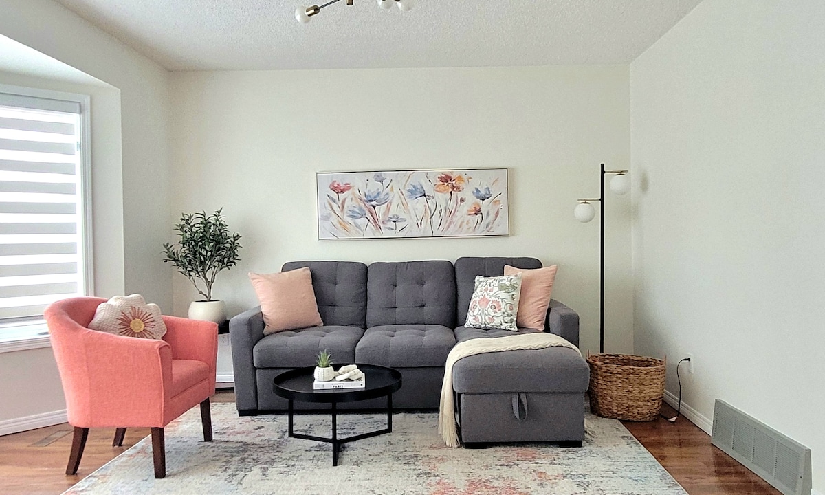Casa ta departe de casă! Bine ai venit în apartamentul nostru recent renovat, luminos și elegant la subsol cu 2 dormitoare. Situat central pentru a accesa partea de sud, West Edmonton Mall, centrul orașului și frumoasa vale a râului. Acesta este un apartament privat într-un cartier liniștit și matur, care poate găzdui confortabil până la 4 persoane. Bucătăria are tot ce îți trebuie pentru a-ți pregăti propriile mese și există o mulțime de spațiu pentru a te relaxa în living, dormitoare și spațiul în aer liber.