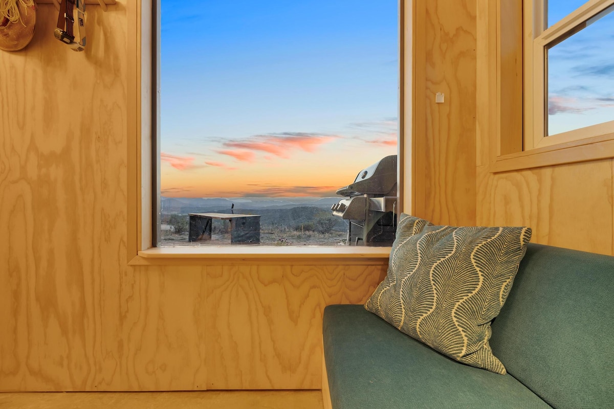 Priveliștea se află deasupra unei văi neatinse, care se întinde în dealuri texturate și orizont dincolo de acesta. Aici, căsuța ta te așteaptă. Deschide ușile duble și găsește tot ce ai nevoie. Un pat suspendat deasupra canapelei, tejghea de bucătărie de 10’, baie cu duș cu faianță și toaletă compostată, colț de luat masa/de lucru și zonă de grătar/relaxare în aer liber. Vino cu un pas. Reconectează-te. Gătește. Citește. Scrie. Salon. Gândește-te. Vino să descoperi un mod ușor diferit de a face lucrurile. Bine ai venit la The Overlook.
