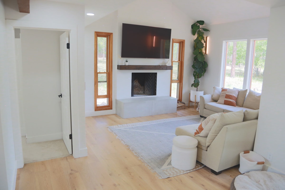 Recent renovată, casă cu 3 paturi/2 băi, de 1600 de metri pătrați, la 7400 de picioare, amplasată în pajiște alpină, la turnoff to Snowbowl. 12 minute până în centrul orașului Flagstaff, 15 minute până la baza Snowbowl, ~60 de minute până la South Rim of Grand Canyon și Sedona. 240V/50A priză în garaj pentru EV. Wi-Fi de mare viteză, YouTube TV. Acces la pădurea națională/trasee nesfârșite chiar pe ușă! Experimentează pacea și liniștea în toate cele 4 sezoane pe 2 hectare murdare, cu priveliști neobstrucționate ale vârfurilor San Francisco chiar din cada cu hidromasaj!