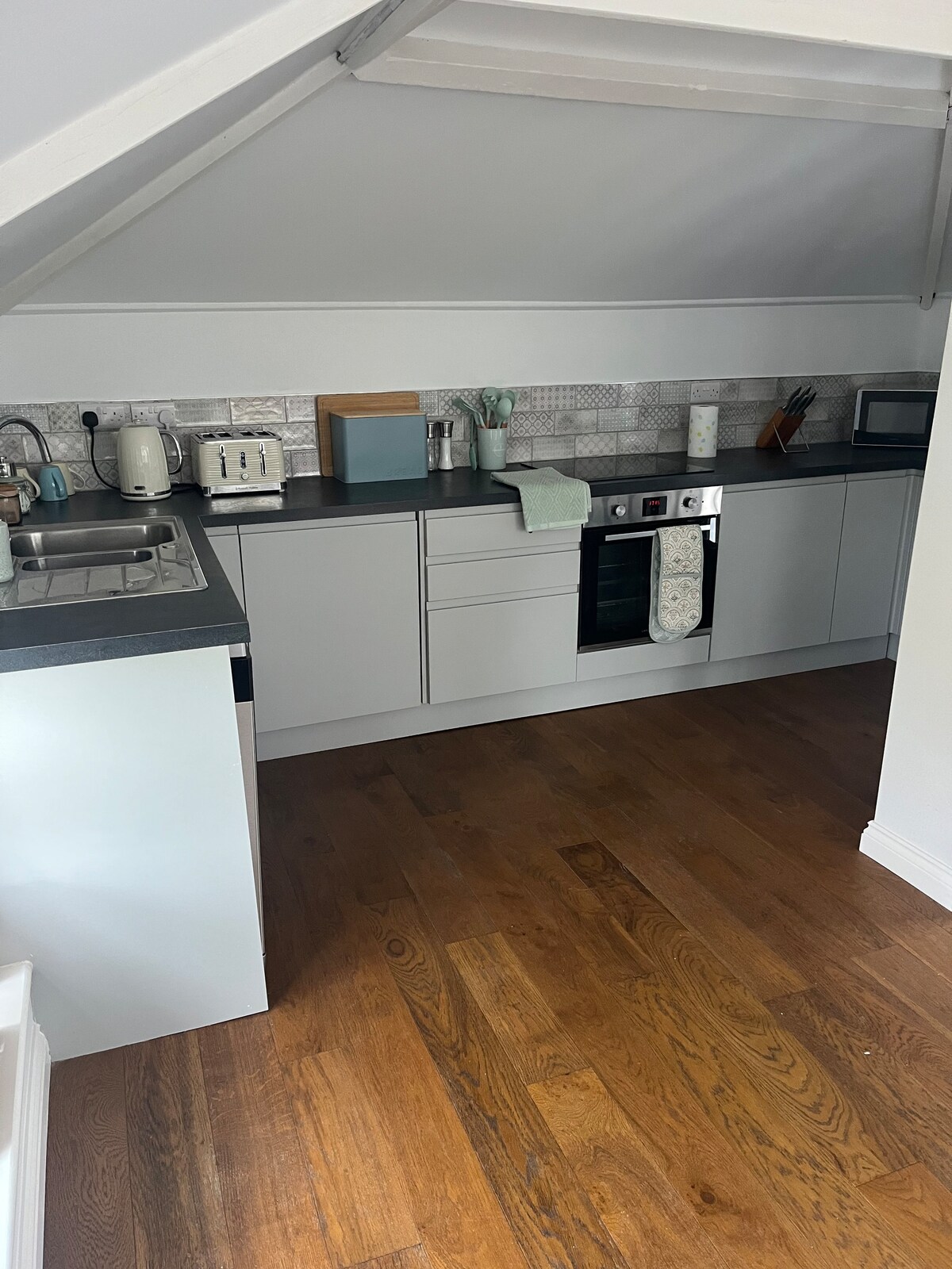 Un apartament în mansardă înrămat de stejar este deasupra unui garaj mare, care este accesat pe scări cu un balcon pentru scaune la nivelul copacilor. Spațiul nu este atașat la casa noastră și are acces separat. Acoperișul înclinat oferă apartamentului un sentiment de spațiu și lumină, cu încălzire prin pardoseală. Spațiul exterior este ideal dacă vrei aer curat. Ne aflăm într-o locație rurală, fără dotări, deși cel mai apropiat sat este la numai 2 mile distanță. Am primi cu brațele deschise toți vizitatorii, dar nu acceptăm copii.