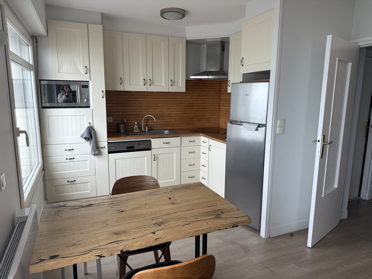 Nou! La Mouette, apartament confortabil și luminos de 28m2 în imediata apropiere a digului, iar plaja a fost complet renovată și echipată pentru 2 persoane, are un dormitor separat și o ședere în bucătărie. Bucură-te de priveliștile sale calme și neobstrucționate ale acoperișurilor din Wissant. Există parcare gratuită în apropiere și există internet de mare viteză (fibră optică) și o cutie TV. Sunt furnizate cearșafuri, huse de plapumă, prosoape și prosoape de ceai, patul este făcut pentru sosirea ta.