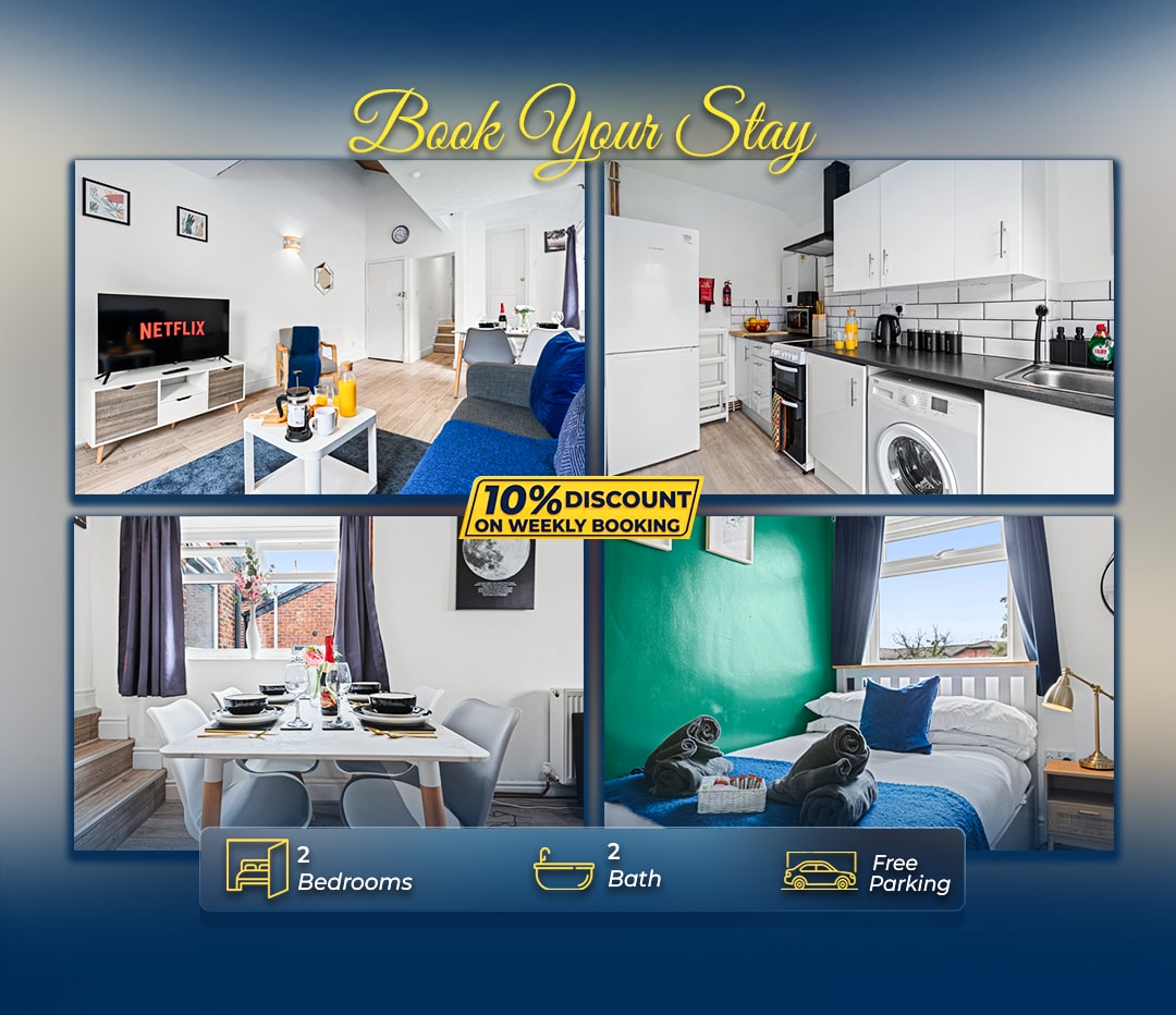 🌟 April Special – Save 15%! Book our modern 2-bedroom flat this month and enjoy a 15% discount. Perfect for contractors and tourists, the property is within walking distance of shops, cafés, and supermarkets. 📍 Located in the charming Didsbury/Withington suburbs. 🚗 FREE private parking (rare for the area!) ✈️ 6 miles from Manchester Airport 🛍️ 6 miles from City Centre. 🛏️ 2 bedrooms with double beds.