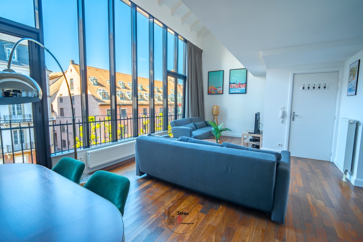Véritable loft et non "style loft" refait à neuf (dans un immeuble construit en 1911 et constitué essentiellement d'entrepôts afin d' y abriter différentes activités commerciales) de 120 mètres carrés, très lumineux, porte blindée, parquet massif, accueil 4 voyageurs, accès très facile (2 minutes à pieds de la gare, accès autoroutes à 500 mètres, accès tramway rapide), possibilité de parkings publics à 300 mètres, situé à 12 minutes à pieds de la Cathédrale de Strasbourg.