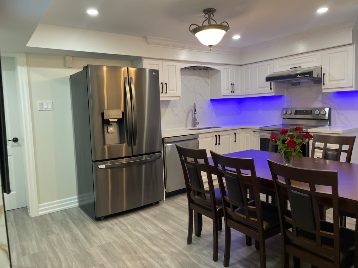 Apartament complet mobilat, de lux, legal, cu două dormitoare, la subsol, cu aparate și paturi noi. Apartamentul are o intrare privată largă în curtea din spate, orientată spre sud, însorită, cu șemineu cu gaz natural, aer condiționat și pardoseală din lemn pentru confort, mașină de spălat privată, uscător, mașină de spălat vase, mașină de spălat vase, aragaz, aparate de bucătărie și frigider. Este aproape de Kleinburg Humber River Trail, McMichael Art Gallary și nu prea departe de Vaughan Mills și Canada Wonderland. Acces ușor la Aeroportul Internațional Toronto pearson.