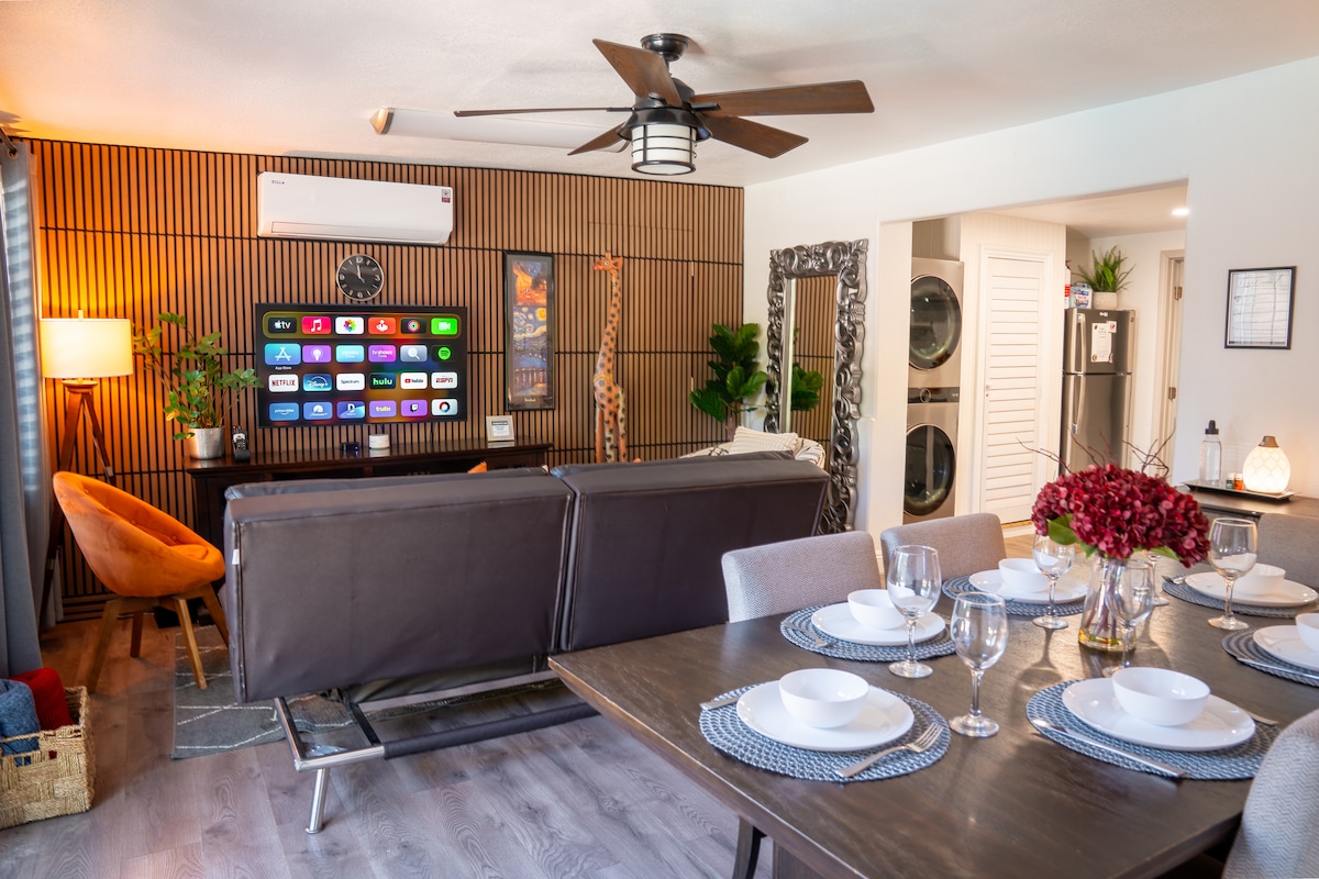 REDU prețul pentru ȘEDERILE DE LUNGĂ DURATĂ! Această garsonieră șic în stil fermă este complet renovată și proiectată profesional. Casa noastră poate găzdui confortabil până la 4 persoane. Locuința include storuri, pat cu spumă de memorie de dimensiuni regale, aer condiționat și unitate de încălzire, imprimantă, Wi-Fi rapid, TV prin cablu, Smart TV de 65 inchi, bucătărie complet aprovizionată cu toate vasele și condimentele de bază, lenjerii de pat de pluș, șampon/balsam/gel de duș, baie spațioasă cu duș mare și coș de rufe cu mașină de spălat/uscător în unitate.