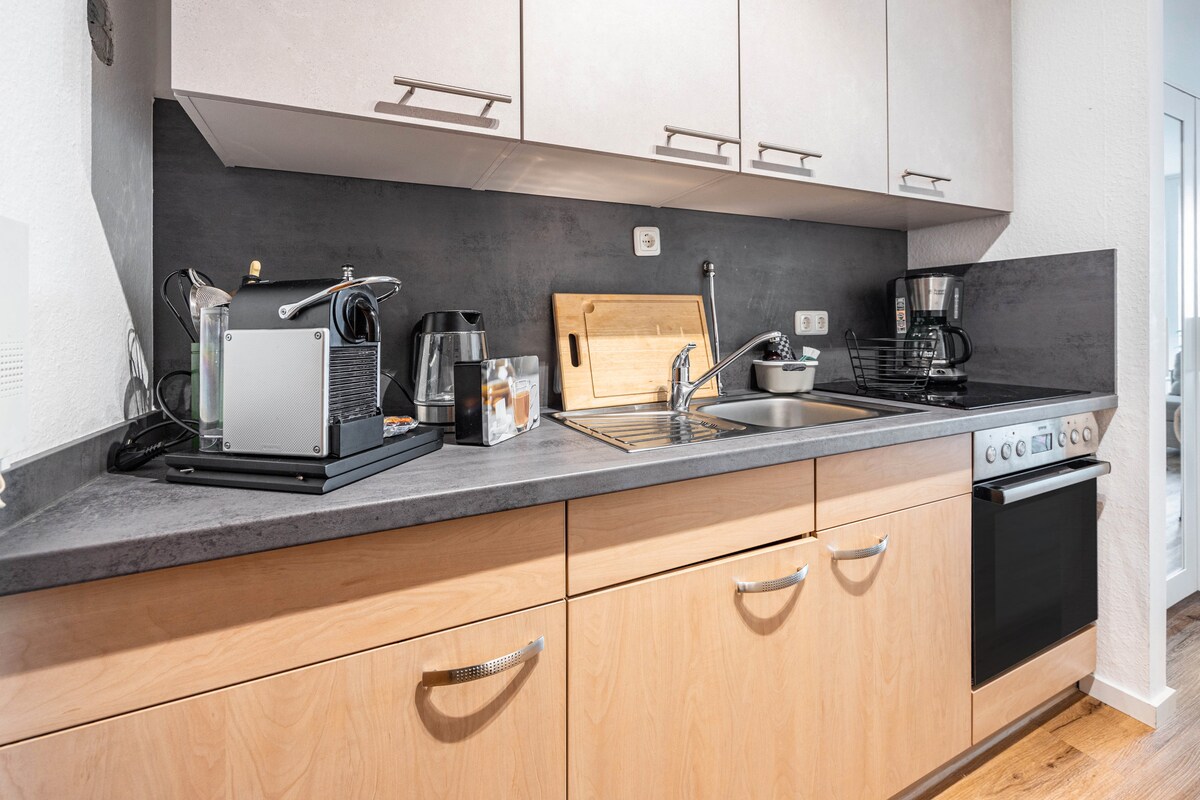 Apartamentul de vacanță oferă 62 m² de spațiu de locuit și găzduiește până la 6 oaspeți. Livingul de 25 m² are 2 paturi de o persoană, o canapea extensibilă de o persoană sau dublă și o zonă de relaxare și de luat masa pentru până la 6 persoane. Dormitorul include 2 paturi de o persoană care pot fi combinate într-un pat dublu, un televizor și o masă cu 2 scaune, ideale pentru nevoile biroului de acasă. Bucătăria este dotată cu plită ceramică, cuptor, cuptor cu microunde, mașină de spălat vase, frigider, diverse aparate mici și suficiente vase pentru cel puțin 6 oaspeți.