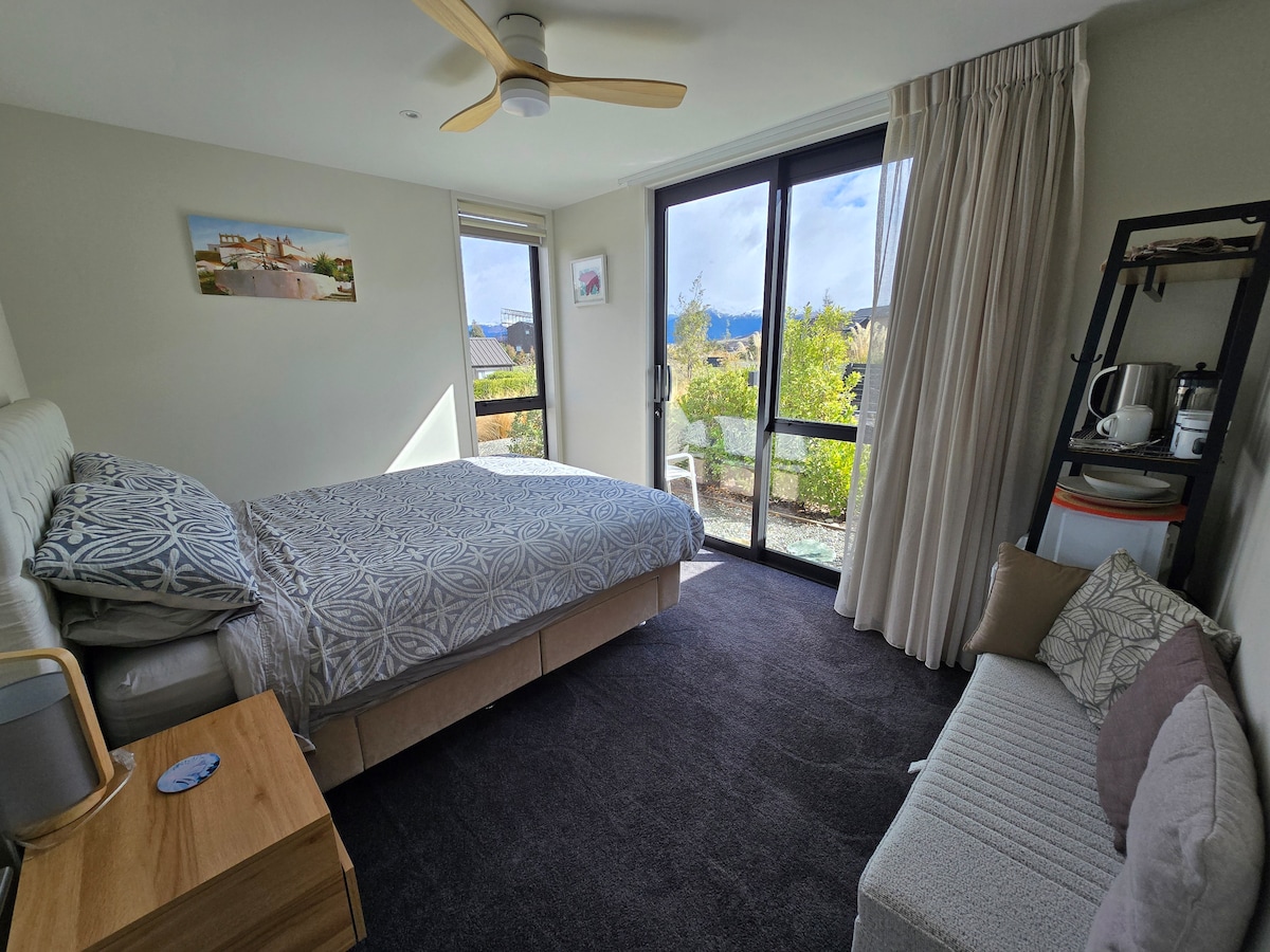 A sun filled one-bedroom, bathroom , studio with king size bed attached to our new home with stunning views of the Remarkables. The living area includes a dinning table, 2 seater sofa, fridge/freezer, microwave, toaster and kettle. There is NO oven or cooktop. The bathroom includes towels and a hairdryer. A 10-min drive from Frankton shops , New World supermarket and the airport, and a 5min walk to The Farmhouse café and shop. The suite has its own private entrance with a lock box.