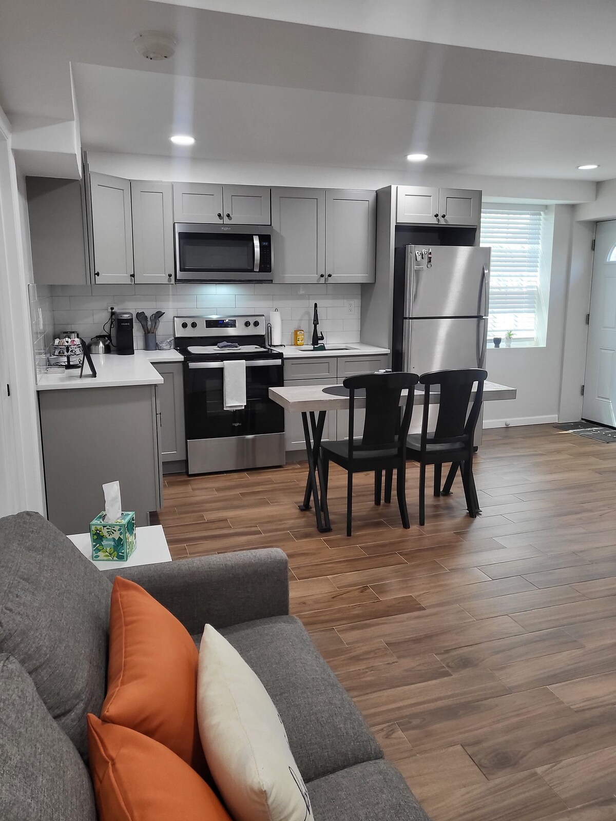 Bucurați-vă de șederea în acest mediu privat, curat și confortabil. Spațiul oferă un dormitor cu un pat dublu și un birou pentru muncă la domiciliu. Livingul include un smart TV și o secțiune. Dezlănțuie-ți bucătarul interior! Acces la ustensile de bucătărie, veselă și oale/tigăi. Parcare gratuită în incintă. Locație convenabilă, cu multe necesități în apropiere (mall/benzinărie/restaurante). Ne aflăm la 2 minute de I-495 și la 15 minute de aeroportul Macarthur. Excelent pentru vizitarea familiei în Port Jefferson, Patchogue, Patchogue, etc!