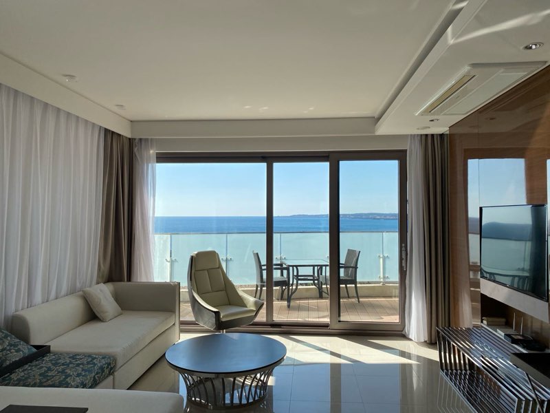 Hello. Perched on a cliff in central Seogwipo, this suite offers ocean views where islands and sea meet on one horizon. The 66㎡ private space keeps you apart from other travelers. Studio-style, yet spacious, with separate bedroom, living, and kitchen zones for an easy flow. On the terrace, soak in the spa and enjoy a private barbecue above the water. Free breakfast served with wide sea views. May to October, swim in the infinity pool facing Beomseom. The rooftop garden captures Jeju sunsets.