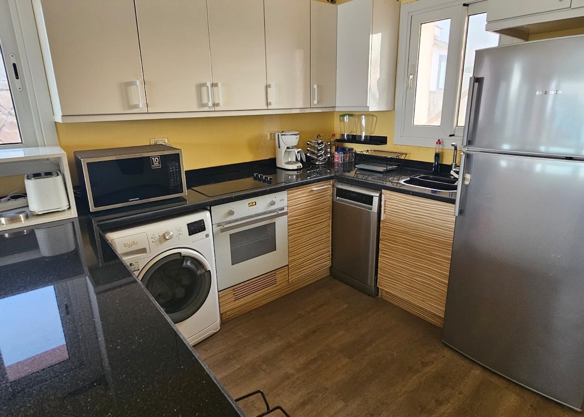 Casă spațioasă 4BR în Mountain View Sokhna 1, ideală NUMAI pentru familii (maximum 8 adulți). 2 camere principale, 3 băi, living cu TV inteligent și IPTV, bucătărie complet utilată și grădină largă. Direct în fața piscinei, lângă piscina încălzită, 3 minute de mers pe jos (~300 m) până la plajă. Dotările satului: în apropierea zonei de joacă pentru copii Dayra Camp, teren de fotbal, club, supermarket, sporturi nautice și port de agrement. NUMAI pentru familii.