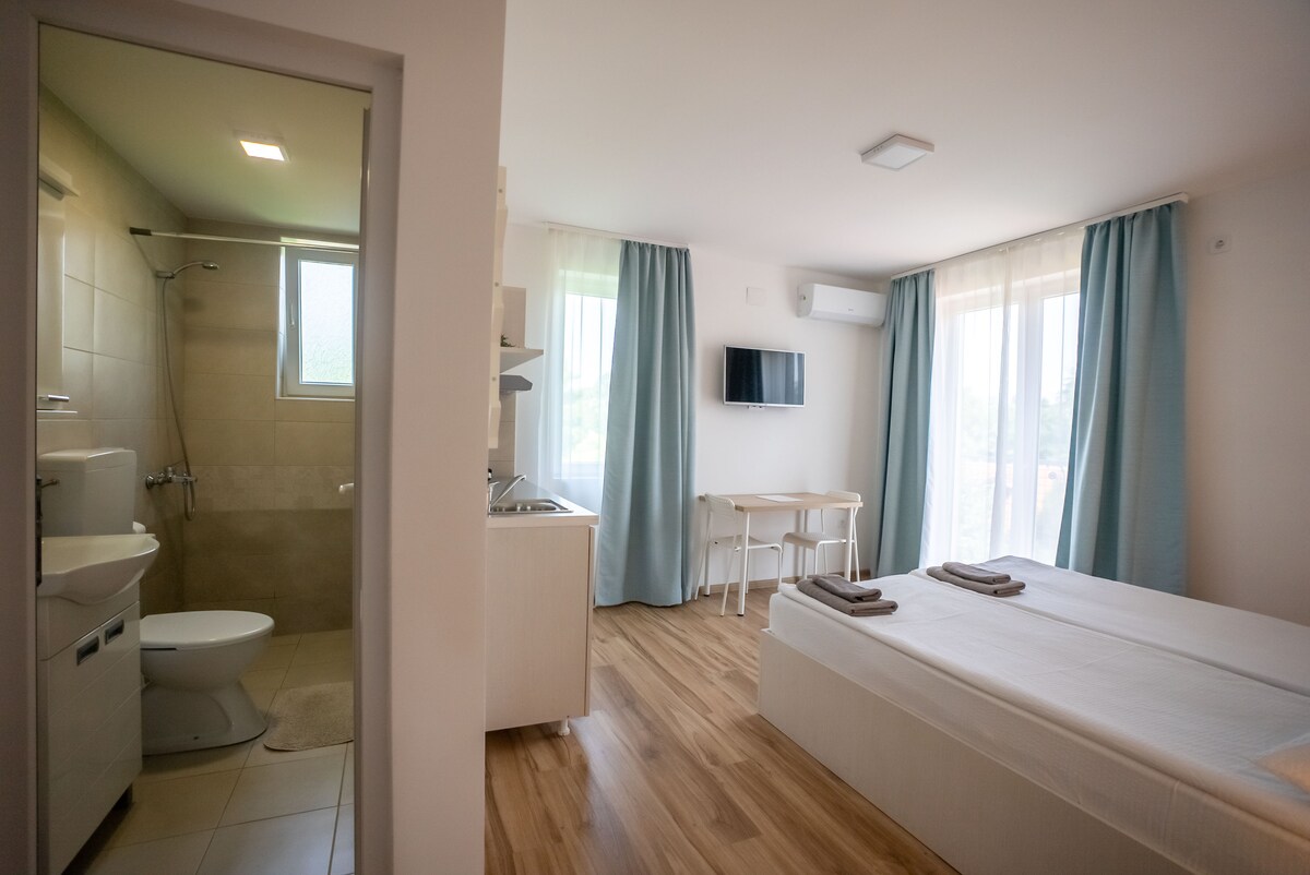 Apartamentul-studio „Ana 6” este situat la etajul al doilea al clădirii noastre de cazare și acoperă o suprafață de 30m2. Are un pat francez, un pat suplimentar, o bucătărie, o baie și un hol. Acesta este singurul apartament din oferta noastră care, din păcate, nu are terasă. Pe ferestre există plase de țânțari PLISA și jaluzele ALU, iar pe pereții izolației termice, ceea ce permite o ședere confortabilă în lunile de vară și de iarnă. Apartamentul are, de asemenea, încălzire centrală.
