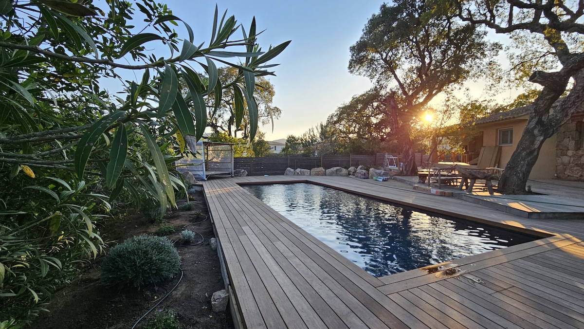 Casă tradițională corsicană inspirată de stâne de piatră și lemn vechi. Confort modern și piscină încălzită în inima maquis-ului. Liniștit, vedere la munte Se compune dintr-un living cu chicinetă, living și șemineu și 2 dormitoare cu cabină de duș. Aduce tot confortul modern necesar Situat ideal: la jumătatea distanței dintre Porto-Vecchio și Bonifacio, Aproape de cele mai frumoase plaje din sudul extrem al insulei. Nu departe de traseele de patrimoniu și siturile care trebuie vizitate
