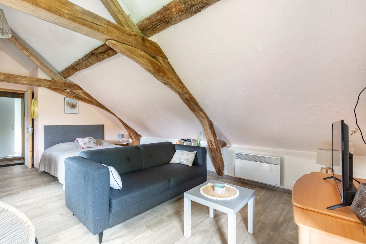 Garsonieră independentă fermecătoare (cameră unică) situată într-un mediu liniștit și împădurit, înconjurat de pajiști și cai. Situat ideal, la 5 minute de grădina zoologică, la 5 minute de La Flèche, la 30 de minute de Le Mans. Descoperă Vallée du Loir. Posibilitatea de a închiria un alt studio pentru 2 persoane cu baie privată. Bine echipat. Consultă studioul de anunțuri adorabil din inima naturii